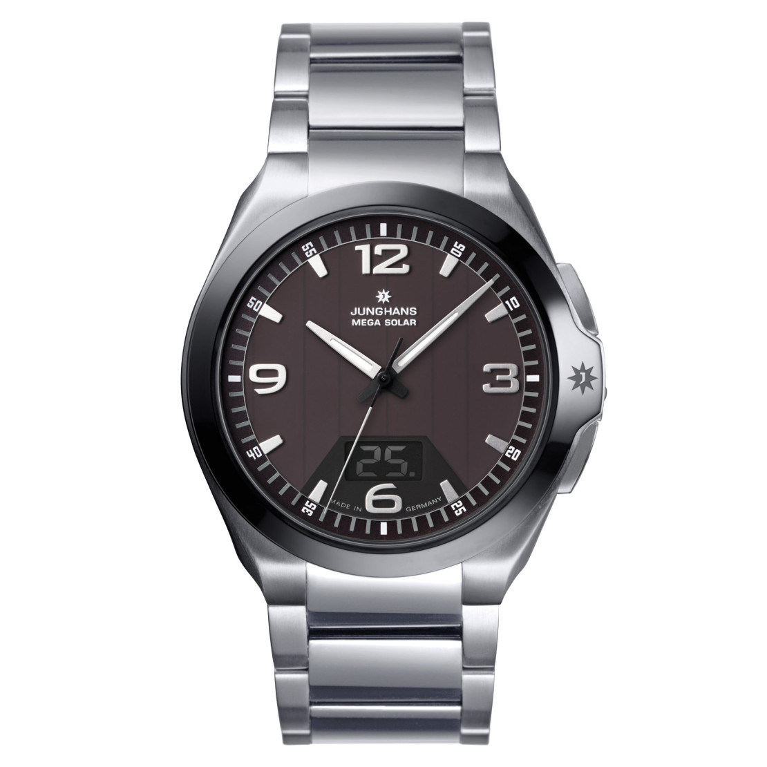 Ref. 18/1121.44 - Kühler Edelstahl, kratzfeste Keramik und eine Wasserdichtheit bis 10 bar machen die Spektrum Mega Solar zu unserer sportlichsten Funkuhr. Angetrieben wird das Junghans Multifrequenz-Funkwerk im Inneren durch die Energie der Sonne. So erweist sich die Spektrum Mega Solar nicht nur als besonders präziser, sondern gleichzeitig auch als besonders ressourcenschonender Zeitmesser.