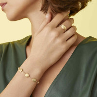 Ref. AB609 B YW - Dieser zarte Ring ist mit einem ovalen Element aus Gelbgold in 18 Karat mit unregelmäßiger Oberfläche geschmückt, die in einer antiken Technik mit dem Fadenstichel von Hand graviert ist, um eine zarte, unregelmäßige Satinierung zu erzielen. Die Ringschiene ist mit kleinen Diamanten in Brillantschliff geschmückt.
