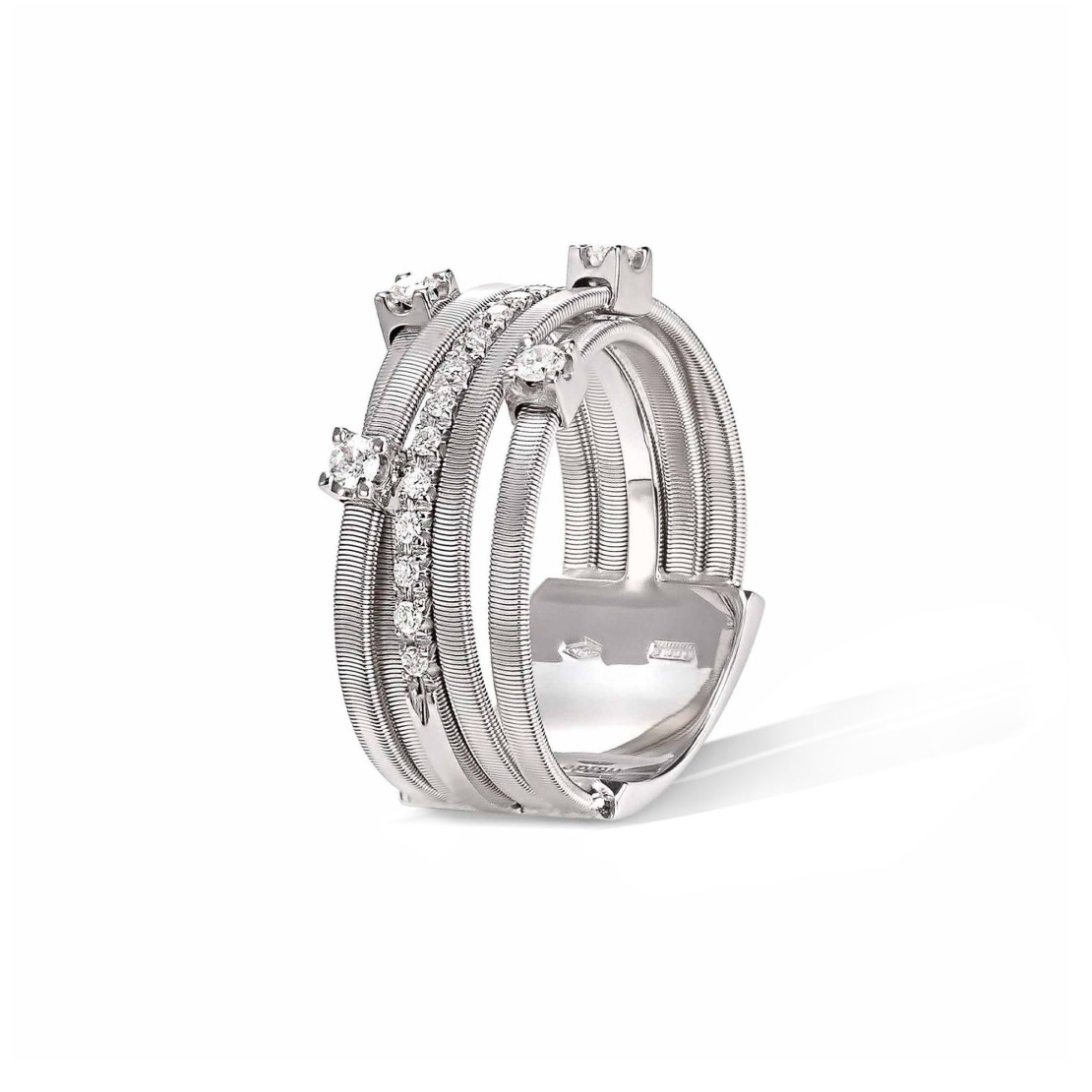 Ref. AG270 B2 W - Dieser elegante Ring aus 18-karätigem Weißgold besteht aus fünf Reihen ineinander verflochtener Flachspiralen. Er ist mit einer Reihe von Diamanten im Brillantschliff geschmückt und bildet ein zeitlos elegantes Prêt-à-porter-Schmuckstück.