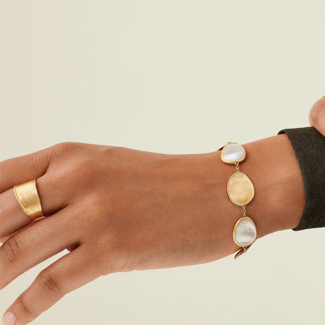 Ref. BB2099 MPW Y - Elegantes Armband mit Blättern aus 18-karätigem Gelbgold, die von Hand mit der traditionellen Fadensticheltechnik graviert sind, im Wechsel mit Blättern aus exklusiv geschliffenem, grauem Perlmutt.