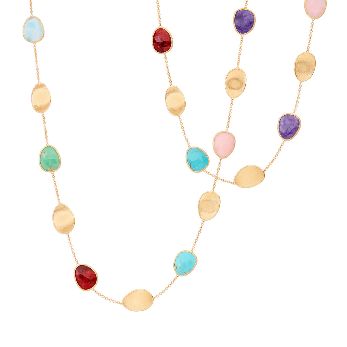 Ref. CB2157 MIX2 Y - Ein äußerst elegantes, wirkungsvolles Statement ist diese lange Halskette, bei der Blätter aus 18 Karat Gelbgold und aus einem Mix von Farbedelsteinen abwechseln. Die Blätter aus Gold sind in einer antiken Technik mit dem Fadenstichel von Hand graviert, um eine zarte, unregelmäßige Satinierung zu erzielen, und an einer feinen Kette befestigt. Das ideale Schmuckstück, um jedes Outfit mit einem farbigen Touch zu komplettieren.