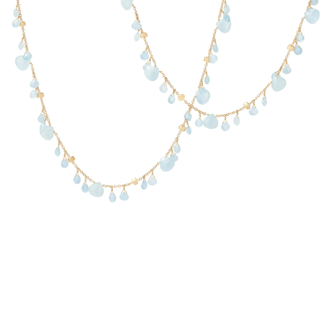 Ref. CB2585 AQ01 Y -Diese wunderschöne lange Halskette mit Anhängern aus Milky-Aquamarinen in charakteristischem Herzschliff wird durch kostbare Nuggets aus Gelbgold mit 18 Karat veredelt, die in einer antiken Technik mit dem Fadenstichel von Hand graviert sind, um eine zarte, unregelmäßige Satinierung zu erzielen. Eine Kreation in zarten, eleganten Farbnuancen, die lang oder zweireihig geschlungen getragen werden kann.