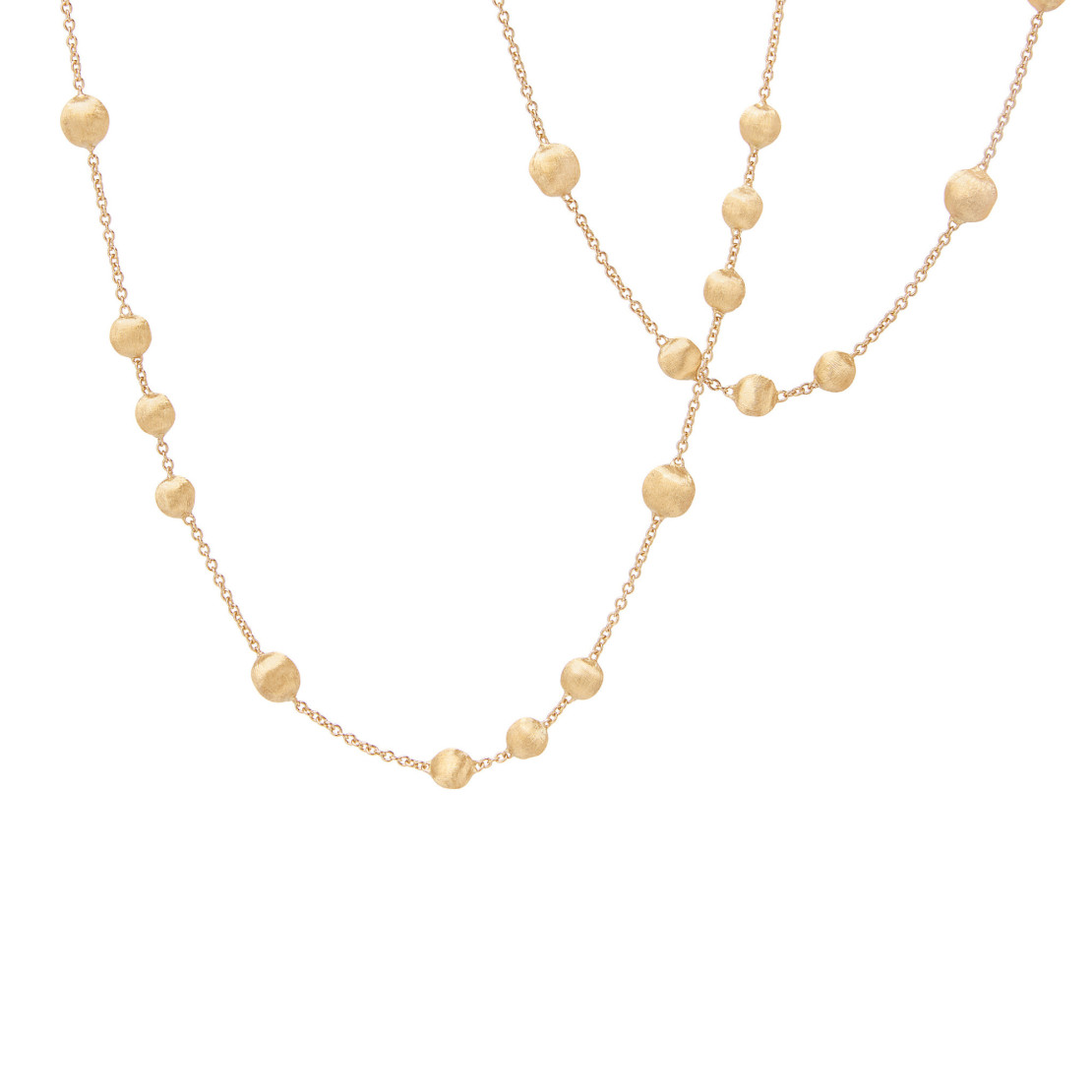 Ref. CB2831 Y - Diese atemberaubende lange Halskette zeichnet sich durch ihre abwechselnde Abfolge von Perlen aus 18 Karat Gelbgold aus. Die unregelmäßige Oberfläche wird mit der alten florentinischen Technik von Hand graviert. Dieses Schmuckstück ist wandelbar und kann auf verschiedene Arten getragen werden, z. B. lang an einer einzelnen Kette oder kurz mit einer doppelten Kette.