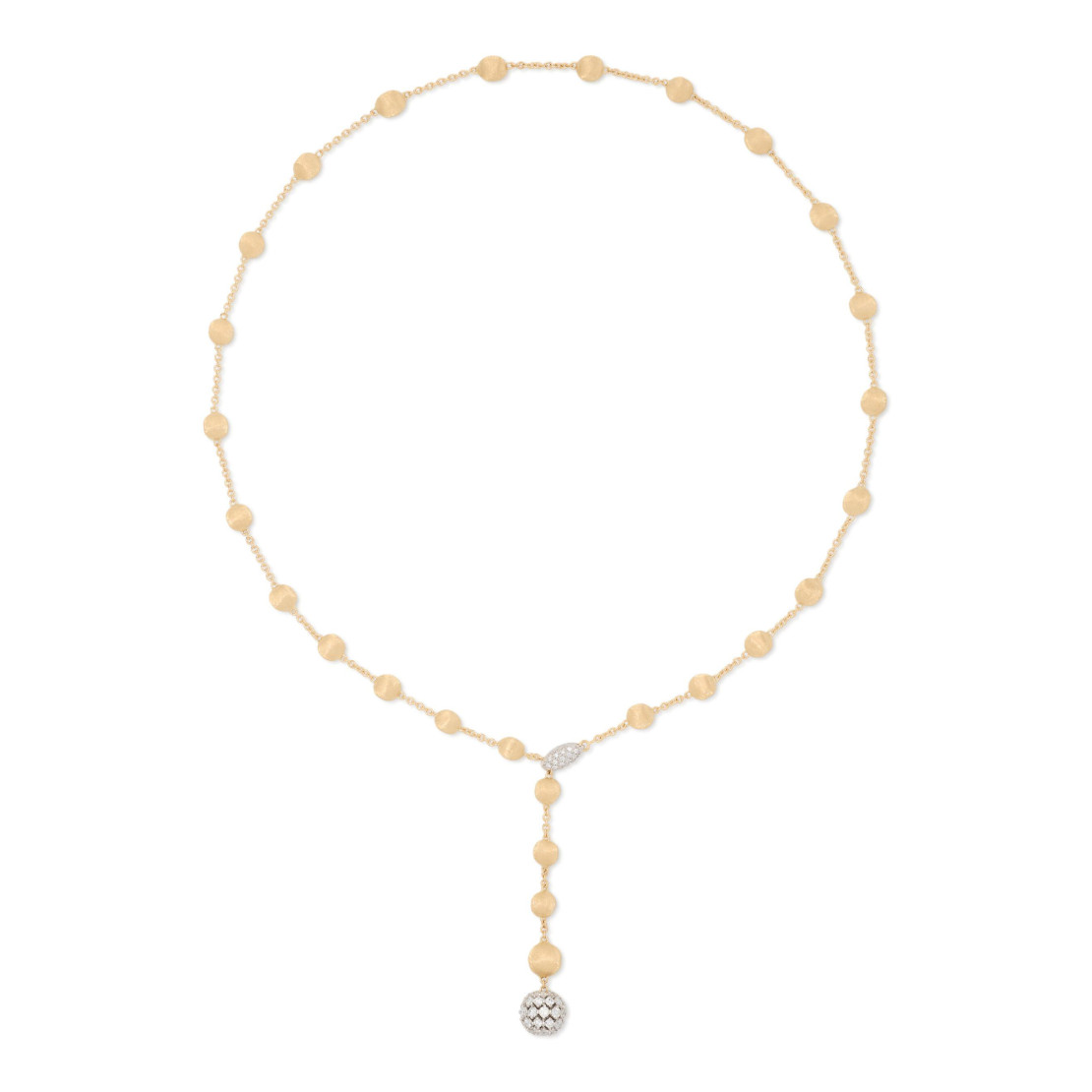 Ref. CB2900-B B2 YW - Diese Y-Halskette besteht aus einer zarten Abfolge kleiner Kugeln aus Gelbgold 18 kt, die mit der antiken Technik des Fadenstichels fein von Hand graviert wurden. In der Mitte endet die Kette mit einer Kugel mit Diamantpavé in Brillantschliff, das bei jeder Bewegung das Licht einfängt. Mit dem verstellbaren Verschluss mit Diamantpavé lässt sich die Länge der Halskette beliebig variieren. Ein Schmuckstück, das Handwerkskunst und modernen Stil vereint.