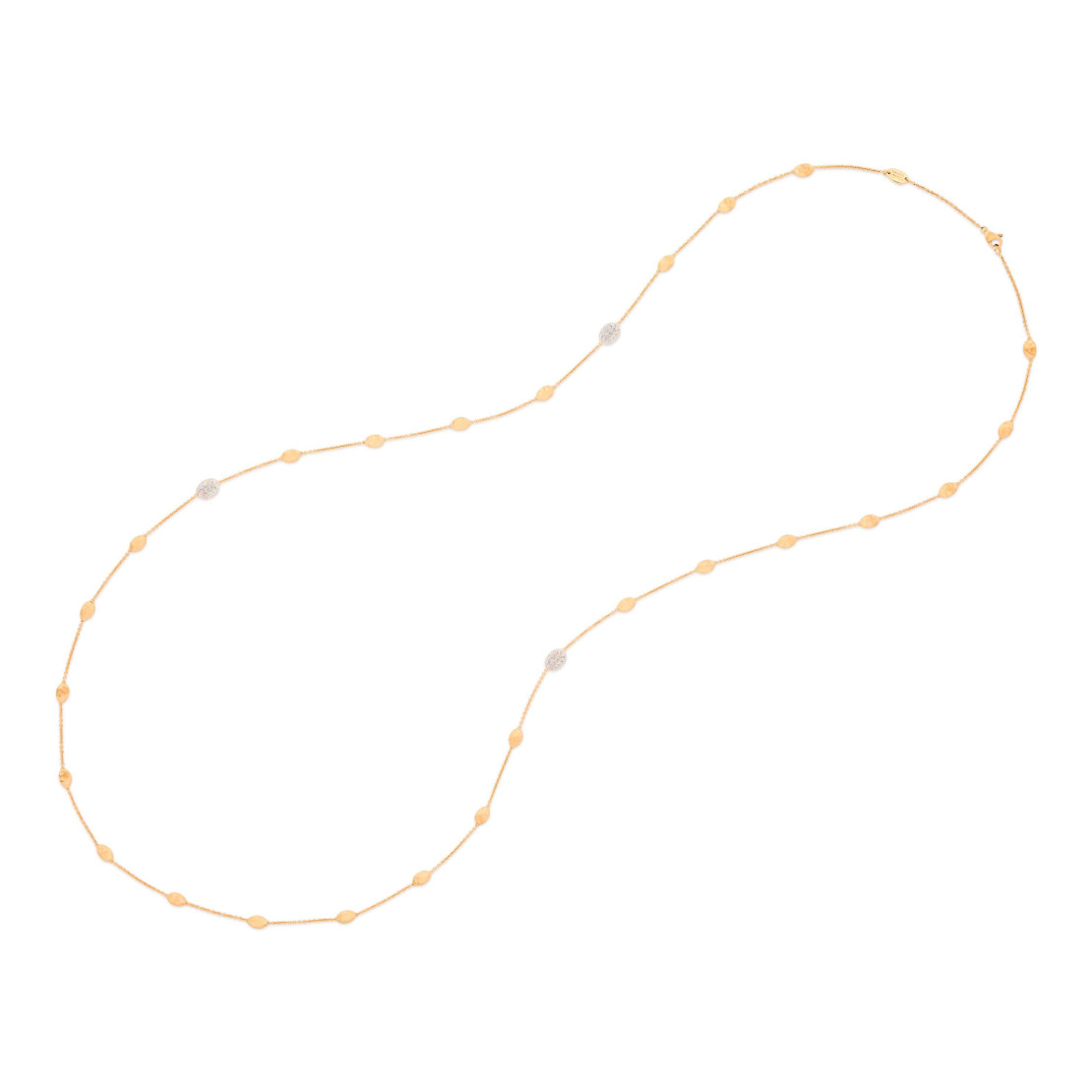 Ref. CB2946 B YW - Ein raffinierte Abfolge kleiner Ovale in Gelbgold mit 18 Karat, deren Oberfläche fein von Hand in der antiken Technik mit dem Fadenstichel graviert ist, ist mit einem ovalen Element verziert, auf dem ein Diamantpavé in Brillantschliff das Licht bei jeder Bewegung mit strahlendem Glanz reflektiert.