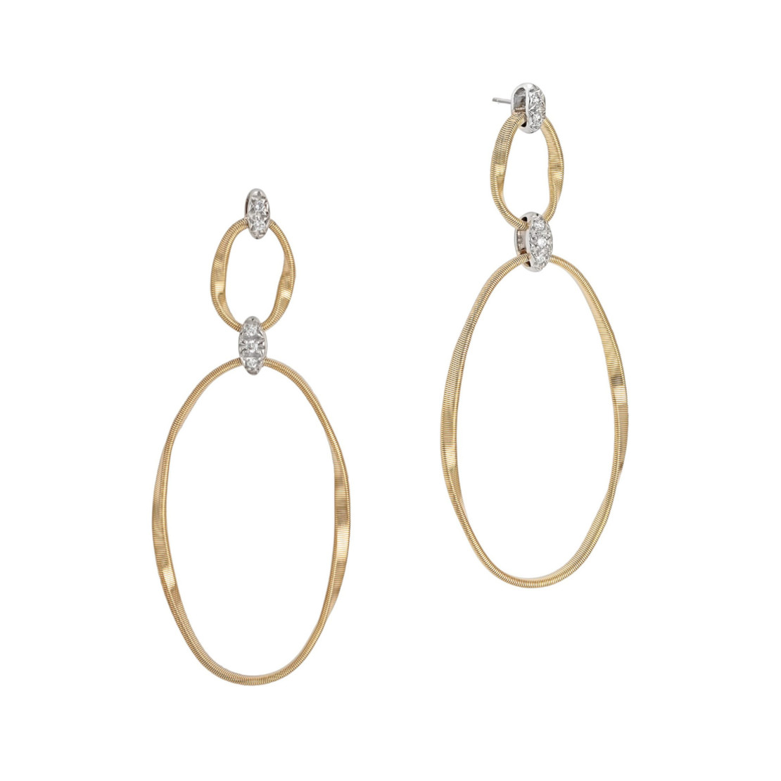 Ref. OG369 B2 YW - Zwei Ovale aus gedrehter Spirale, die mit der exklusiven handwerklichen Coil-Technik gefertigt sind, verbinden sich zu einem Schmuckstück von schlichter Eleganz. Der Ohrring aus Gelbgold mit 18 Karat ist mit einem Haken mit Diamantpavé in Brillantschliff geschmückt.