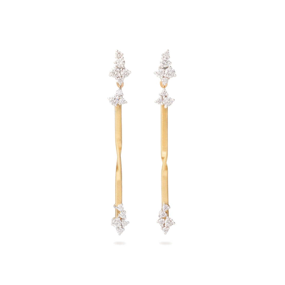 Ref. OG420 B YW - Diese eleganten und skulpturalen Hängeohrringe aus 18 Karat Gelbgold zeigen ein gedrehtes Band, das mit der exklusiven Coil-Technik gefertigt wurde. An den Enden schaffen zwei unregelmäßig gefasste Diamantpavés einen glanzvollen, dynamischen Effekt, der das Licht bei jeder Bewegung einfängt.