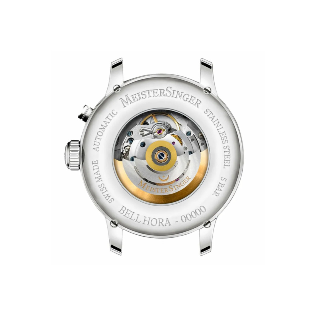Ref. BHO913 - Das Edelstahlgehäuse mit 43mm Durchmesser ist bis 5 bar wasserdicht und trägt ein einseitig gewölbtes Saphirglas über dem Zifferblatt. Oberhalb der Krone (bei 2 Uhr) ist ein Drücker angebracht, mit dem sich das Klangsignal der Bell Hora ein- und ausschalten lässt. Durch den 4-fach verschraubten Glassichtboden lässt sich das Werk bei seiner Präzisionsarbeit beobachten.