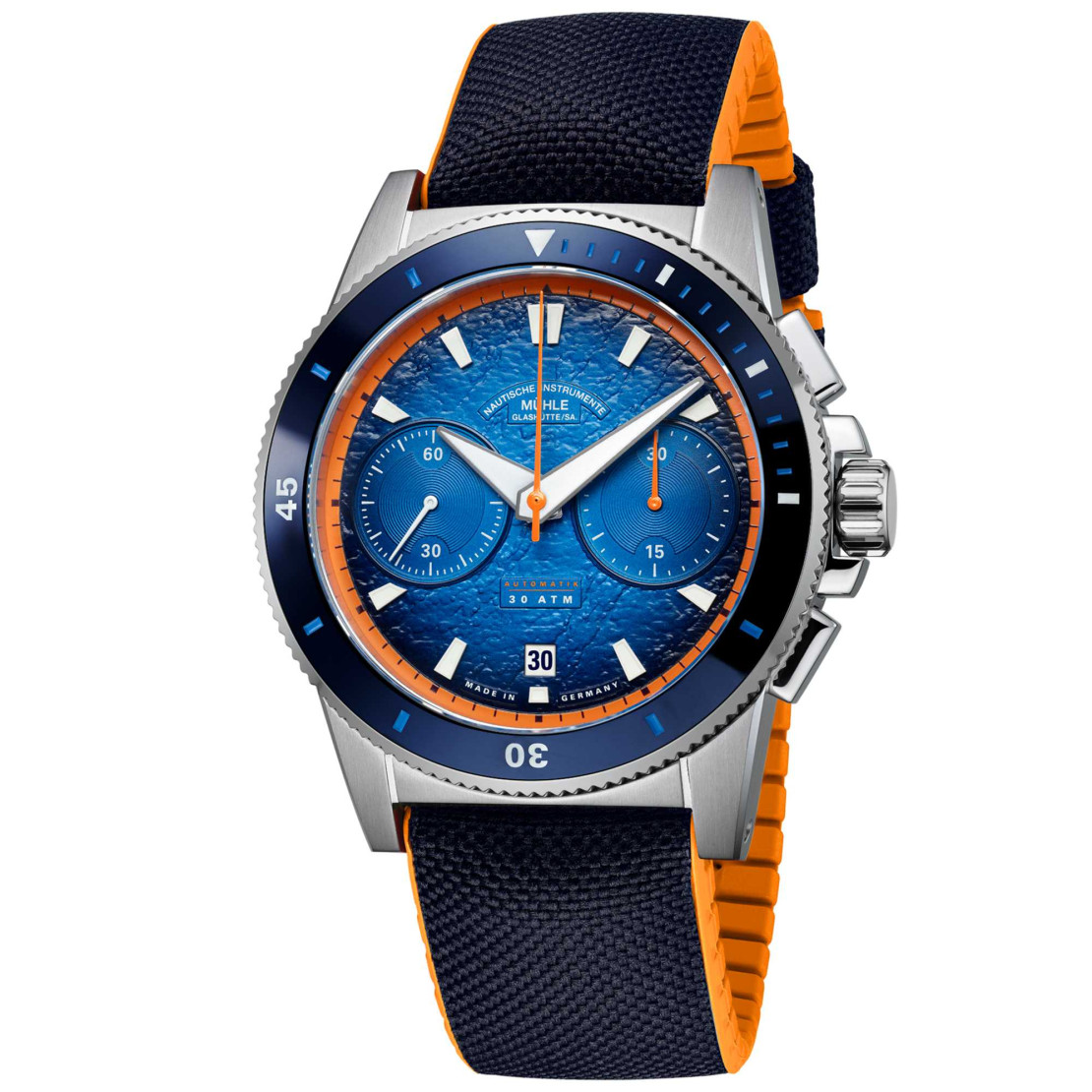 Ref. M1-52-02-CK - Der Sportivo Active Chronograph hat sich auf die Disziplinen sportliche und mechanische Höchstleistungen spezialisiert. Wird seine Chronographen-Funktion mit dem fein polierten Drücker bei 2 Uhr in Gang gesetzt, erlaubt sie Zeitmessungen von bis zu 30 Minuten. Das qualifiziert ihn als perfekten Begleiter für intensive Intervall-Workouts oder Ein-Kilometer-Trainings für angesagte Hyrox-Events.