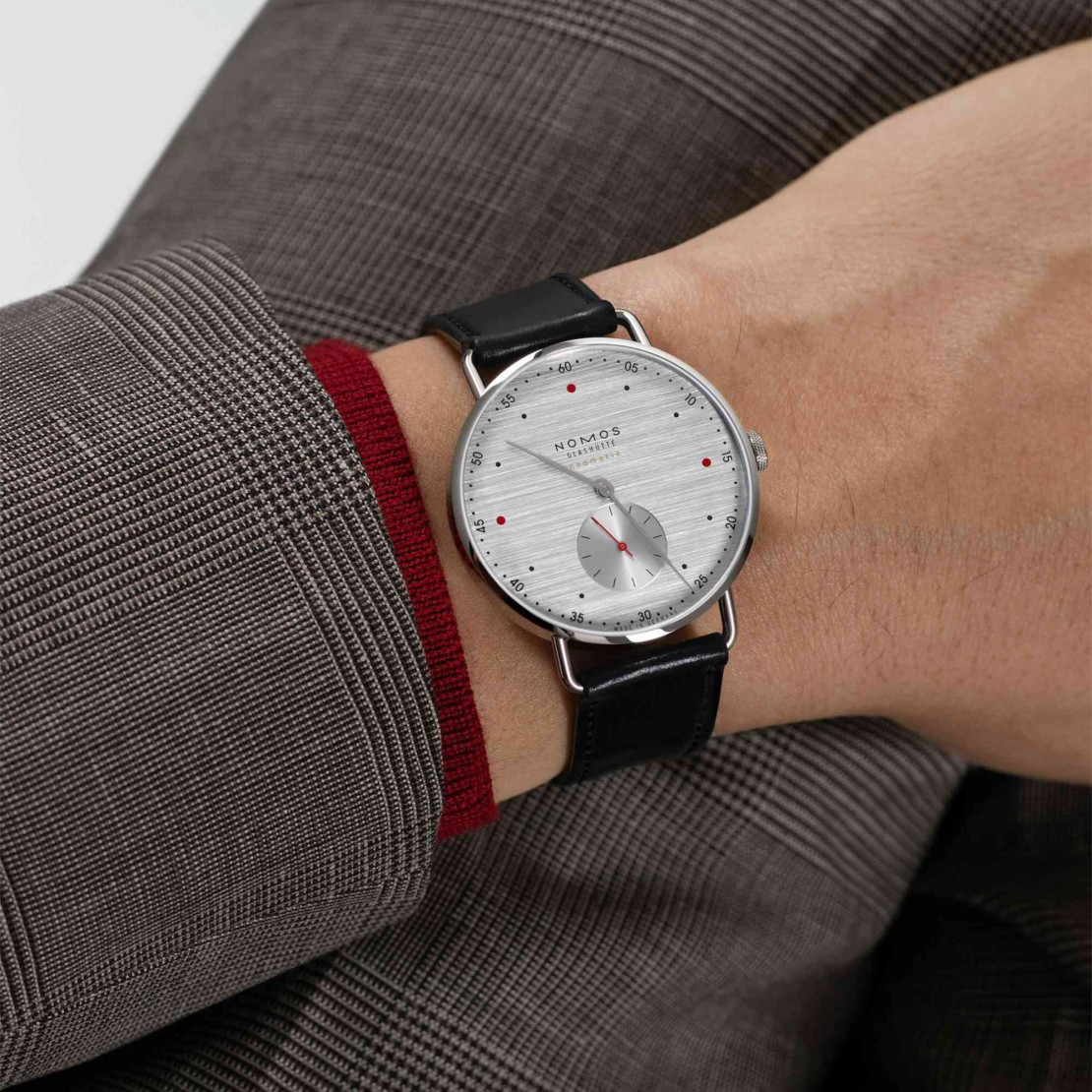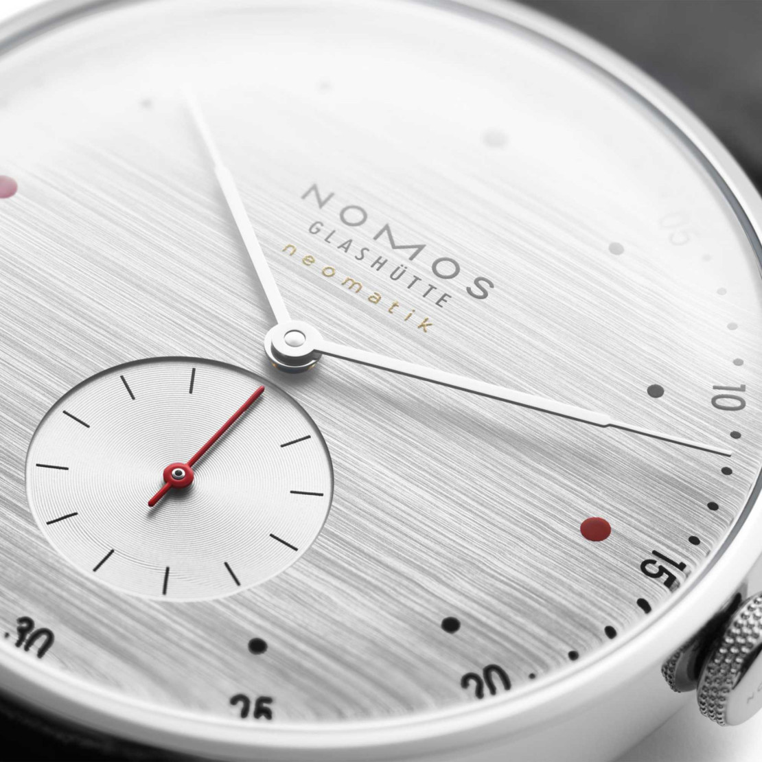 Ref. 1114 - Metro silvercut ist die Automatikuhr für den besonders souveränen Auftritt: mit besten Proportionen, markant und groß, dabei unglaublich flach und präzise dank neomatik-Kaliber. Klassisch seriös wirkt auch das minimalistische Blatt in kühlem Silbergrau – die Stundenindizes in Lippenstiftrot erzählen dabei stumm von letzter Nacht.