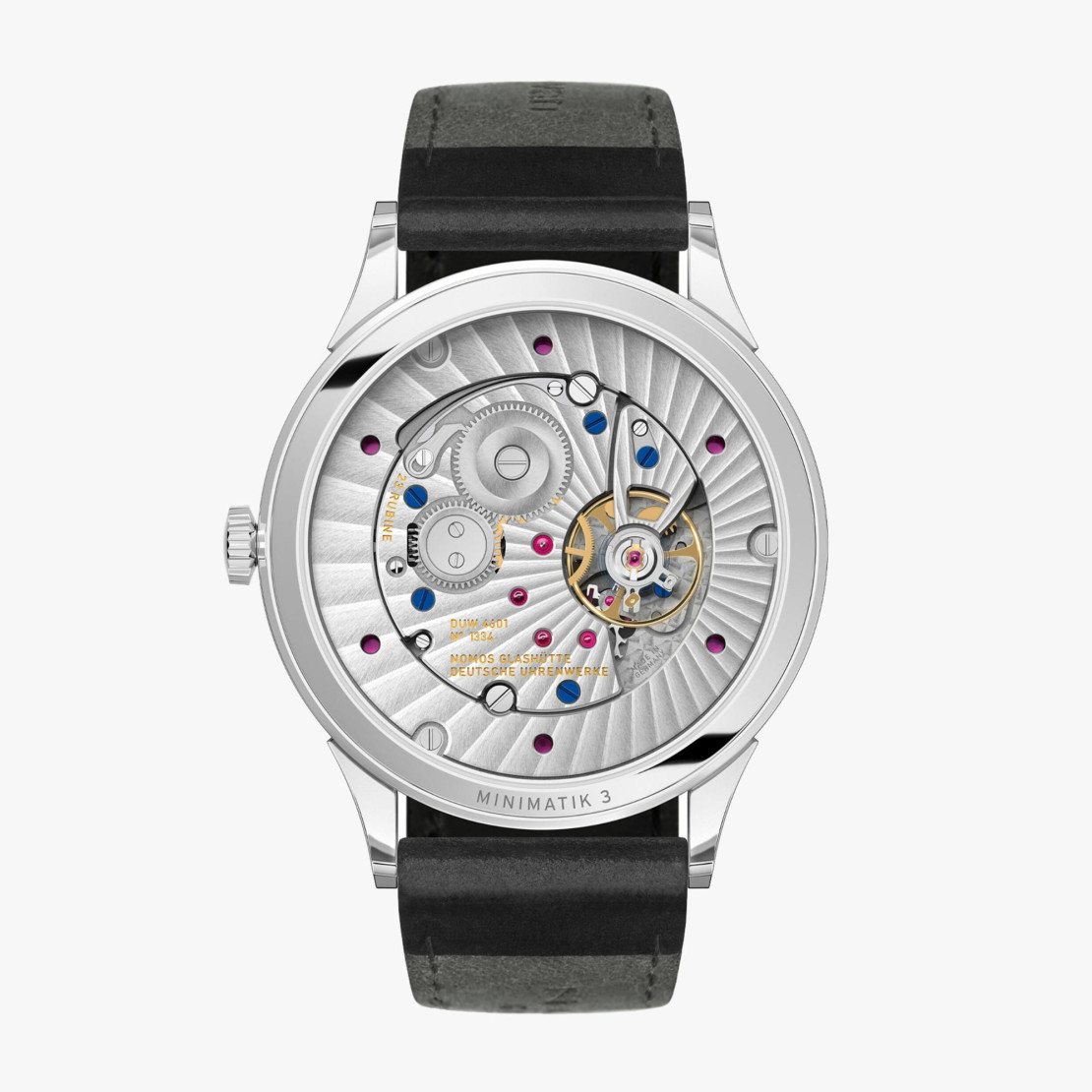 Ref. 1252 - Und klassisch auf 3 Uhr: Der Tag in Gold! Minimatik ist eine Dresswatch für jeden Anlass – und ganz besonders für den besonderen. Das offen gestaltete Zifferblatt mit integrierter kleiner Sekunde, rhodinierten Zeigern und moderner Typografie erhält durch das Datumsfenster mit Goldrand das i-Tüpfelchen an Grazie, das über den Tag hinausführt. Und es verweist zugleich auf das manufakturgefertigte Datumskaliber, das im Inneren der Handaufzugsuhr präzise tickt – mit einem Datumsring in Zifferblattfarbe.