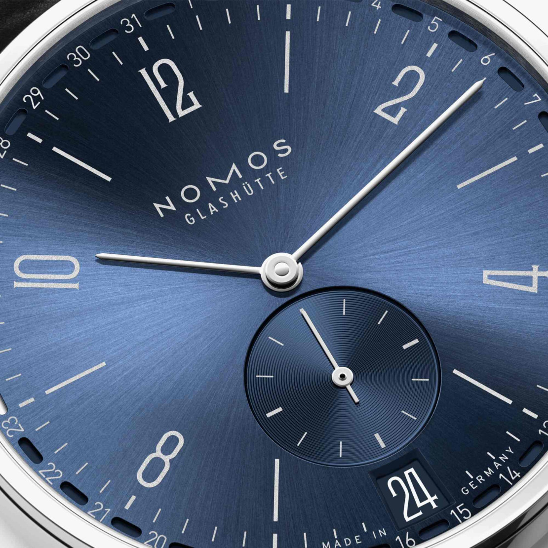 Ref. 136.SB - Wegweisend: Zwei Markierungen rahmen beim umlaufenden NOMOS-Ringdatum den aktuellen Tag ein. Auf dem tiefblauen Zifferblatt mit silberfarbenen Ziffern und Indexen sind sie weiß – wie das Datum im zusätzlichen Fenster auf 6 Uhr. Die zweifache Datumsanzeige bewahrt Blick aufs Ganze und fokussiert gleichzeitig das Detail. Tangente 2date ist das erste Handaufzugsmodell, das über das exklusive Ringdatum verfügt. Und etwas zarter als das neomatik-Update-Modell: der Gehäusedurchmesser beträgt 37,5 Millimeter.