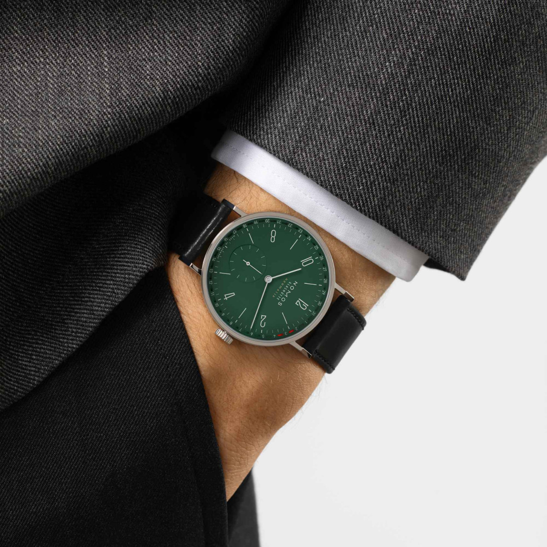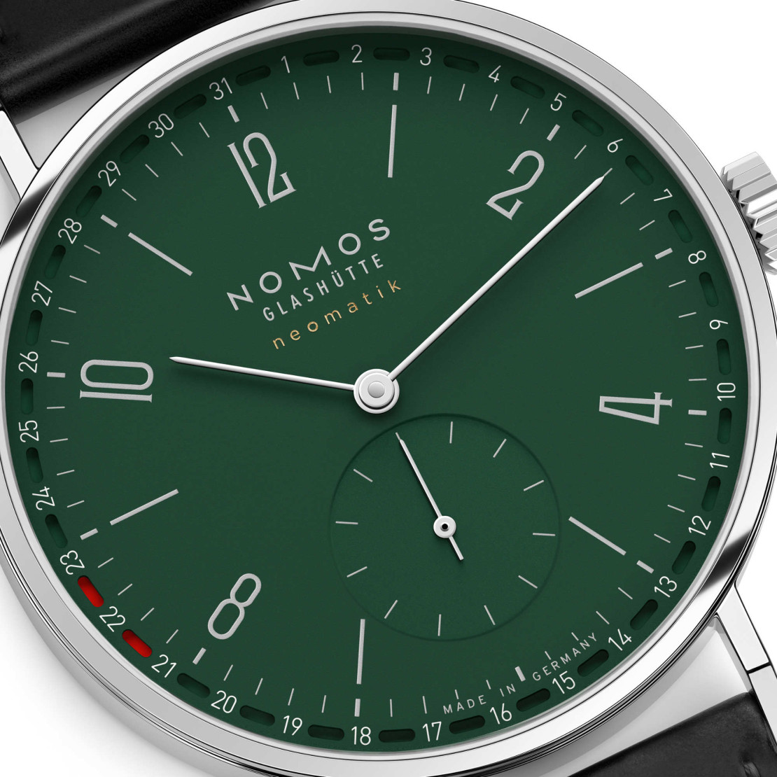 Ref. 148.SB - Das patentierte Ringdatum in tiefem Grün – eine kraftvolle und zugleich ruhige, harmonische Farbe, die das Zifferblatt von Tangente neomatik Update mit dem Gehäusedurchmesser von 38,5 Millimeter unverwechselbar macht. Grün ist eine sehr individuelle Uhrenfarbe, ohne dabei zu laut zu werden, und formell wie traditionell bestens zu kombinieren. Eine souveräne Dresswatch aus unabhängiger Manufaktur.