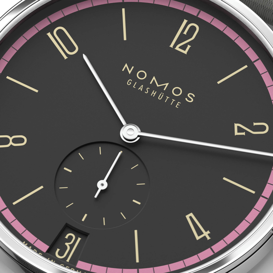 Minutenring pink, Außenring schwarz, Datumshintergrund schwarz