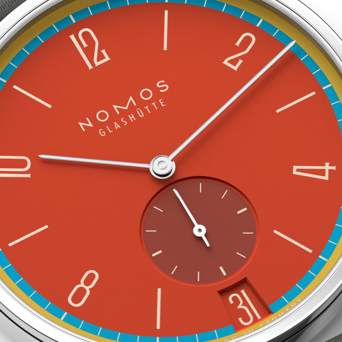 Ref.179.S28 - Die Ikone in Farbe. Voller Kraft und Komplexität. Für die Sonderedition der Handaufzugsuhr Tangente 38 mit Datumsfunktion wurden zahlreiche Elemente des Zifferblatts individuell auf den Charakter der Uhr abgestimmt. 31 besondere Modelle für jeden Tag des Monats sind daraus entstanden, 31 Persönlichkeiten – auf je 175 Exemplare limitiert. Tangente Datum Sportbunt ist in Anlehnung an den alten, sehr geliebten DDR-Trainingsanzug unseres Uhrendesigners Thomas entstanden; die Uhr erinnert aber auch sonst an die Mode der 70er-Jahre, an olympische Ringe und eine strahlende und heitere Zeit der Jugend.