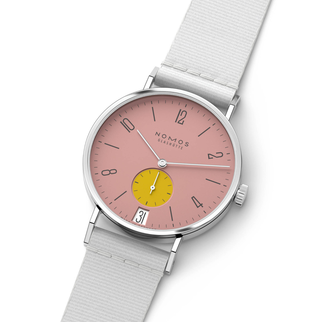 Ref.179.S7 - Die Ikone in Farbe. Voller Kraft und Komplexität. Für die Sonderedition der Handaufzugsuhr Tangente 38 mit Datumsfunktion wurden zahlreiche Elemente des Zifferblatts individuell auf den Charakter der Uhr abgestimmt. 31 besondere Modelle für jeden Tag des Monats sind daraus entstanden, 31 Persönlichkeiten – auf je 175 Exemplare limitiert. Tangente Datum Bubblegum ist eine fröhlich kunstsinnige Uhr: Die gelbe Sekunde auf rosa Grund wirkt wie ein sommerliches Seidenkleid, passt aber auch zu Anzug und Krawatte perfekt – nur Mut!