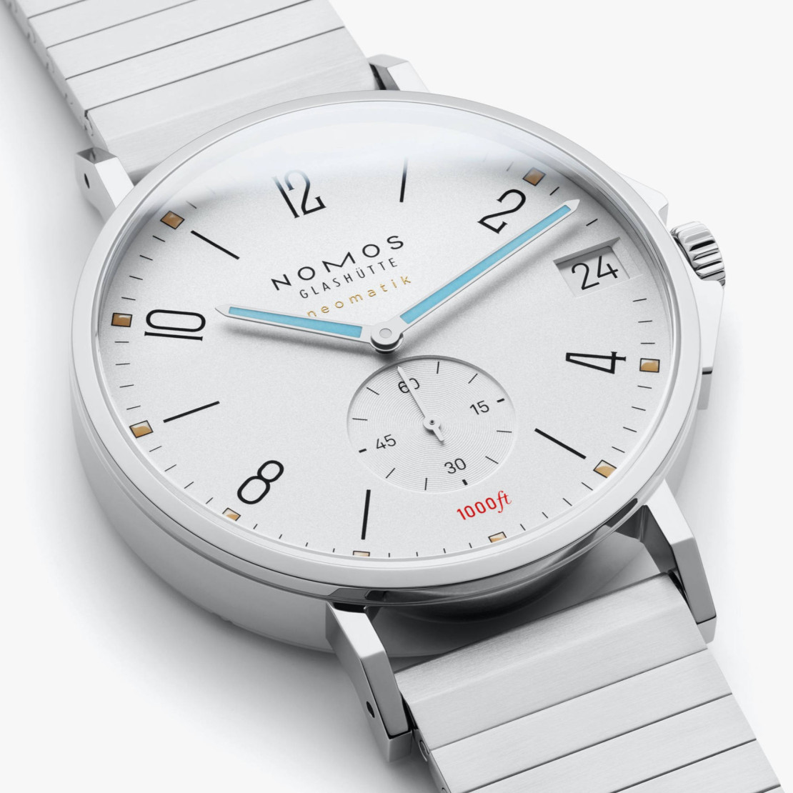 Ref. 580 - Mehr als ein NOMOS-Klassiker in sportlich: Die bis 1000 Fuß wasserdichte neomatik-Uhr Tangente Sport ist obendrein eine Schönheit von höchstem Tragekomfort. Hier die Version mit klassisch weiß versilbertem Zifferblatt. Und extragroßem Datum auf der Drei: Dieses verdankt die Uhr neomatik-Datumskaliber DUW 6101.