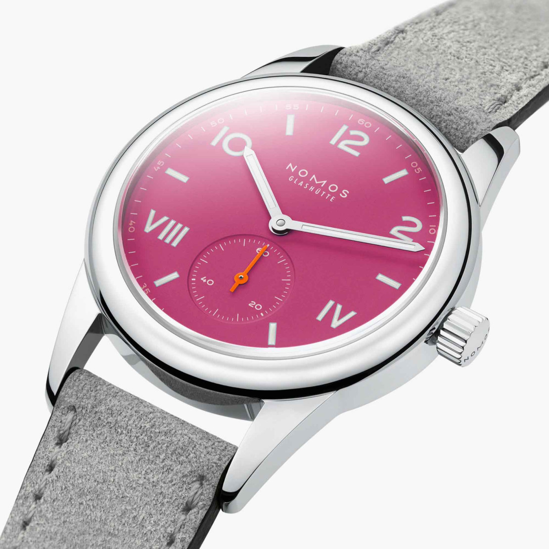 Ref. 711 - Eine Uhr für viele Gelegenheiten. Club Campus deep pink hat ein robustes, hochglänzend poliertes Stahlgehäuse mit breiter Lünette und ist bis 100 Meter wasserdicht. Mit Superluminova ausgelegte Ziffern, Zeiger und Stundenindexe leuchten in der Dunkelheit und unter Wasser blau nach. Abwechslungsreich und klar ist das Zifferblatt. Minuten- und Sekundenziffern in Weiß erhöhen die Ablesbarkeit, der Sekundenzeiger macht in Neonorange seine Runde. Die Handaufzugsuhr aus Glashütte ist mit dem zuverlässigen NOMOS-Manufakturkaliber Alpha ausgestattet. Deep Pink steht für ein positives Lebensgefühl. Diese Uhr motiviert für die nächsten eigenen Ziele und macht Mut, neue Wege zu gehen.