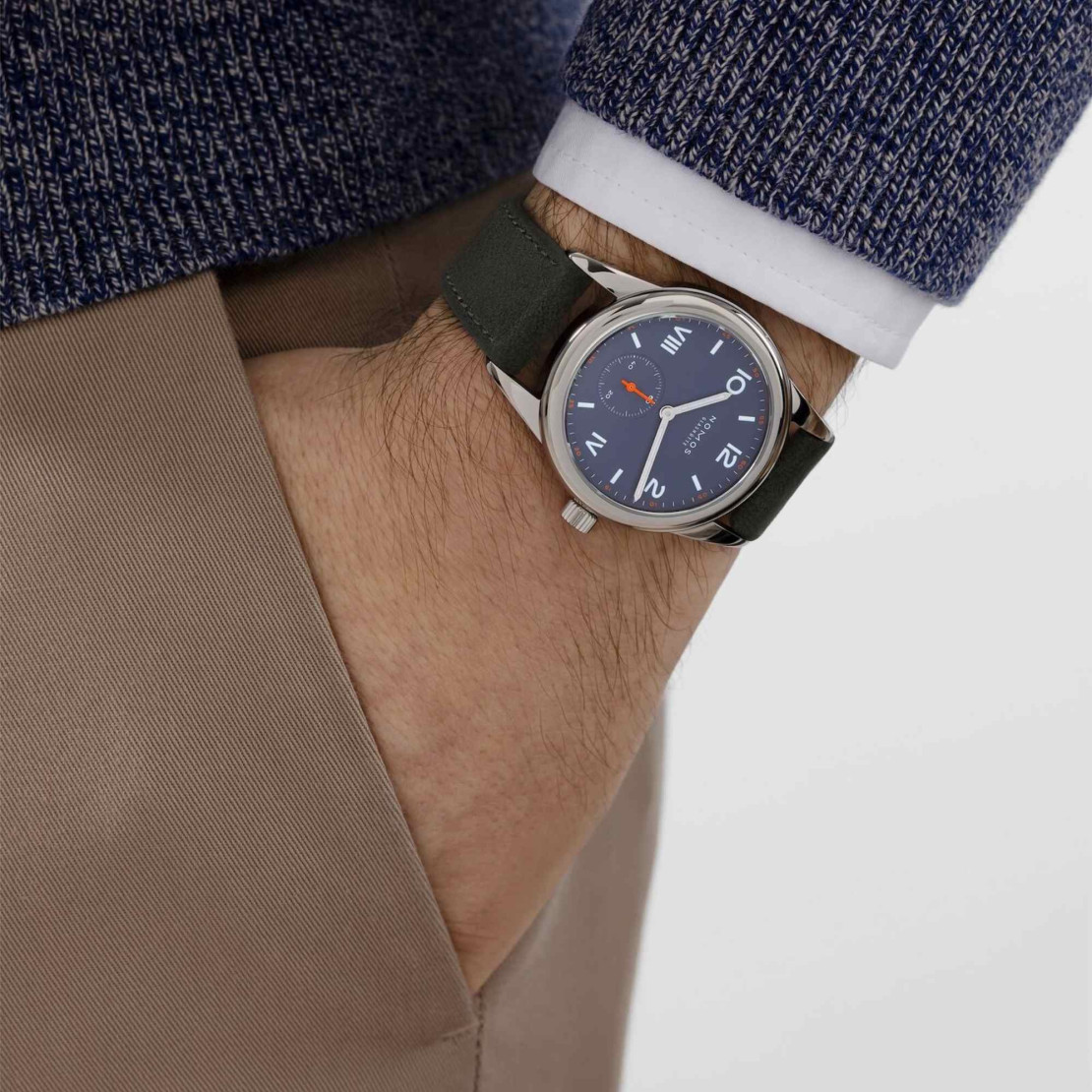 Ref. 713 - Eine Uhr für viele Gelegenheiten. Club Campus blue purple hat ein robustes, hochglänzend poliertes Stahlgehäuse mit breiter Lünette und ist bis 100 Meter wasserdicht. Mit Superluminova ausgelegte Ziffern, Zeiger und Stundenindexe leuchten in der Dunkelheit und unter Wasser blau nach. Abwechslungsreich und klar ist das Zifferblatt. Minuten- und Sekundenziffern in Neonorange erhöhen die Ablesbarkeit, auch der Sekundenzeiger macht in Neonorange seine Runde. Die Handaufzugsuhr aus Glashütte ist mit dem zuverlässigen NOMOS-Manufakturkaliber Alpha ausgestattet. Club Campus blue purple ist inspirierend und expressiv. Die vielseitige Uhr aus der Glashütter Manufaktur begleitet durchs sportliche Leben.