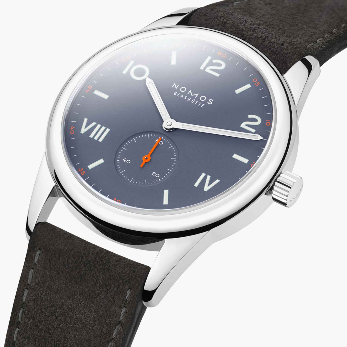 Ref. 730 - Eine Uhr für viele Gelegenheiten. Club Campus 38 blue purple hat ein robustes, hochglänzend poliertes Stahlgehäuse mit breiter Lünette und ist bis 100 Meter wasserdicht. Mit Superluminova ausgelegte Ziffern, Zeiger und Stundenindexe leuchten in der Dunkelheit und unter Wasser blau nach. Abwechslungsreich und klar ist das Zifferblatt. Minuten- und Sekundenziffern in Neonorange erhöhen die Ablesbarkeit, auch der Sekundenzeiger macht in Neonorange seine Runde. Die Handaufzugsuhr aus Glashütte ist mit dem zuverlässigen NOMOS-Manufakturkaliber Alpha ausgestattet.