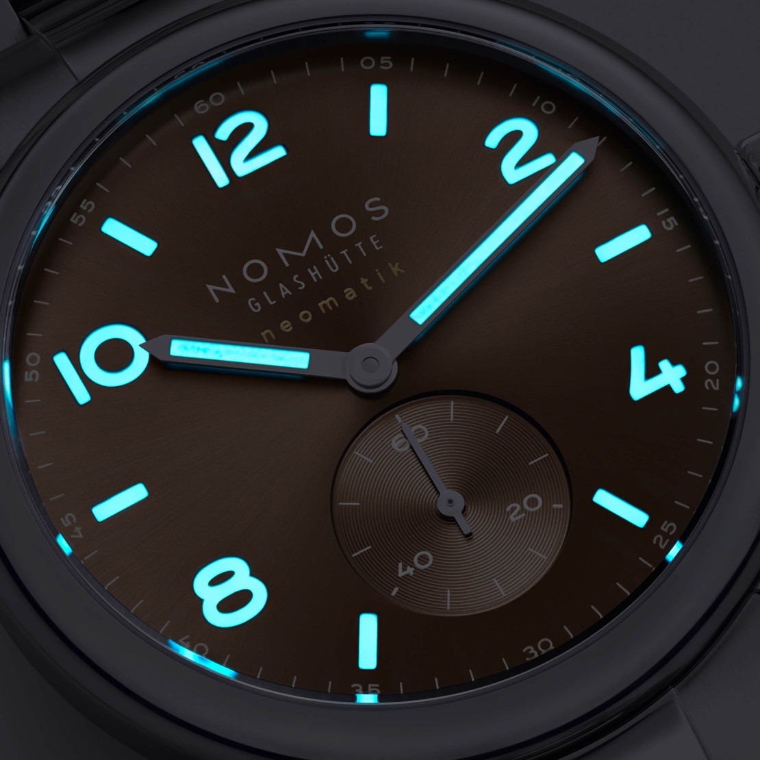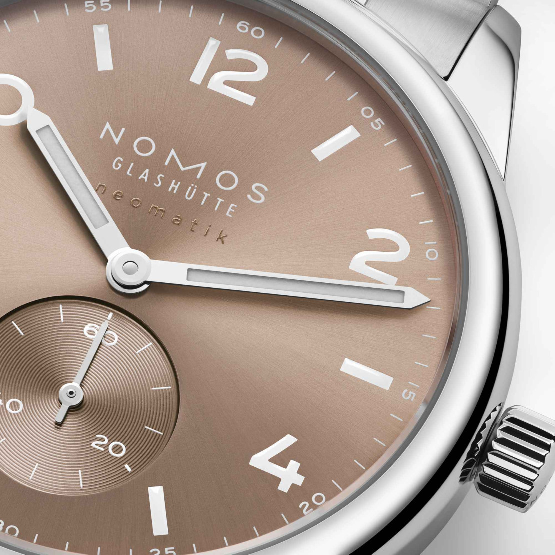 Ref. 762 - Die Farbe dieses galvanisierten und mit Strahlenschliff veredelten Zifferblattes ist in der reichen Palette von Gold, Platin, Kupfer oder Bronze zuhause: Ember, auf deutsch Glut, ein Farbton der Reife und des Erfolgs. Im sportlich-robusten Gehäuse mit einem Durchmesser von 39,5 Millimetern ist die Glashütter Automatikuhr Club Sport neomatik 39 ember bestens proportioniert und wasserdicht bis 20 atm. In ihrem Inneren arbeitet das manufakturgefertigte Automatikkaliber DUW 3001 mit hauseigenem Assortiment NOMOS-Swing-System.