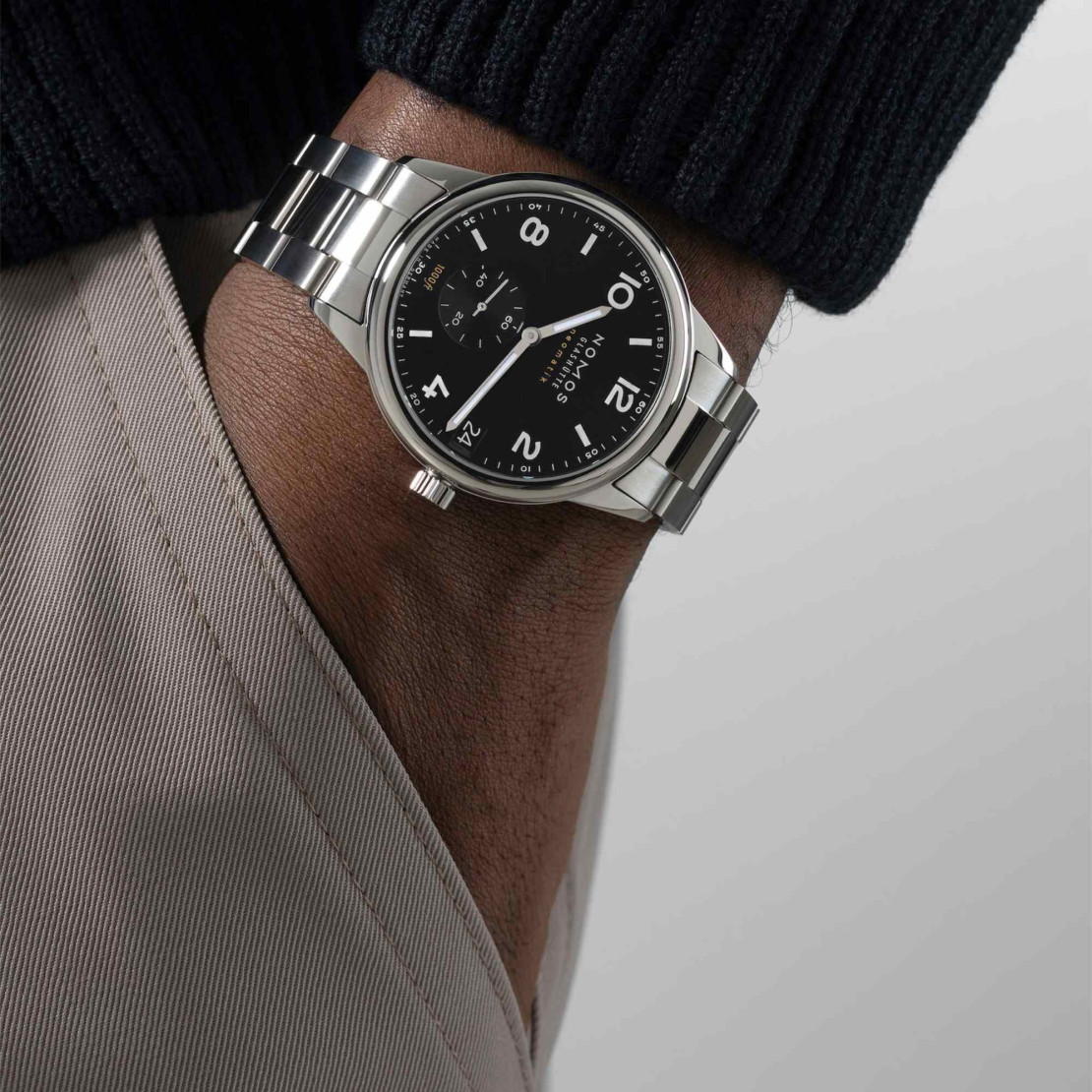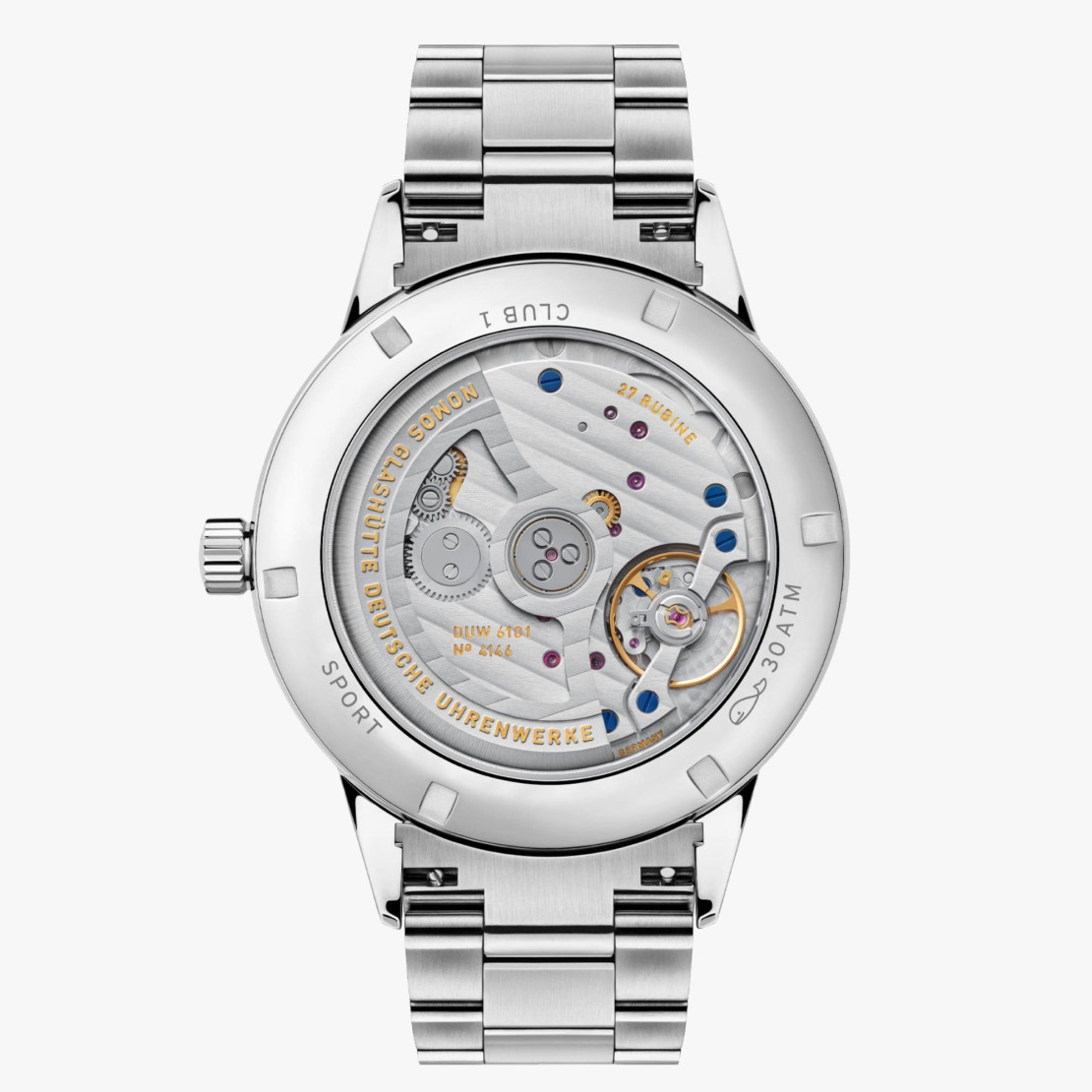 Ref. 781 - Club jetzt ganz neu – mit Lust auf Abenteuer: Diese große NOMOS-Uhr ist bis 1000 Fuß, also 30 atm, wasserdicht. Mit dem hochinnovativen und äußerst präzisen neomatik-Datumskaliber und dem neuen NOMOS-Metallband ausgestattet, ist Club Sport neomatik 42 Datum schwarz die Uhr fürs überaus zeitgemäße Handgelenk.
